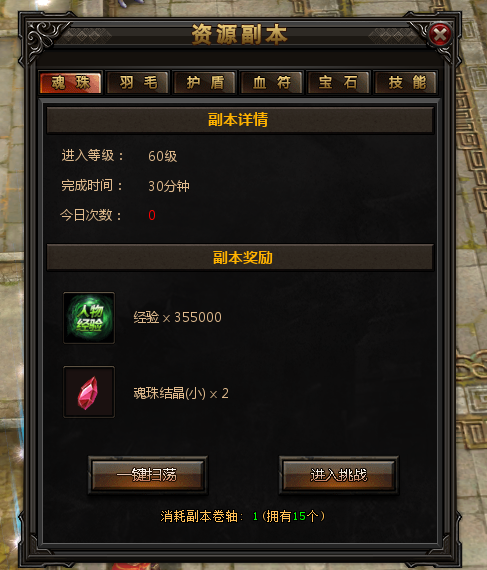 每日可在比奇城内的资源副本处接取塔防副本任务,完成后可获得经验,羽毛,血符,宝石奖励。